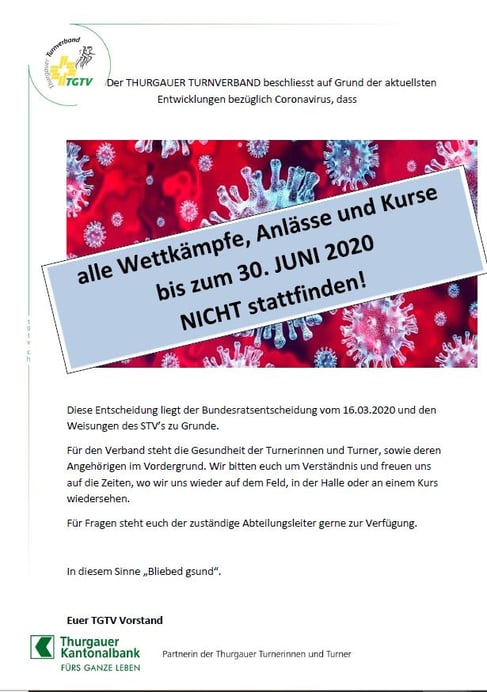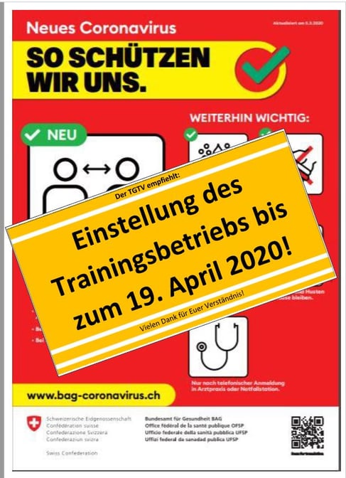 Aufgrund der vom Bund beschlossenen Massnahmen nehmen auch wir uns in die Pflicht, die Verbreitung des Virus möglichst einzuschränken. Nachdem am Freitag bereits die Trainings der Jugendriegen